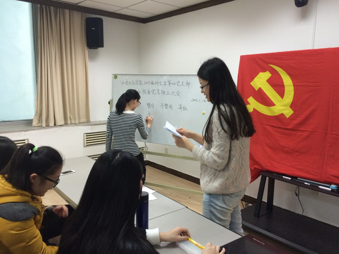 2015年1月14日14点,汉语文化公司2015级研究生第四党支部在主楼B302室召开了预备党员转正大会。会议由支部书记韩文慧主持,除一人病假外,第四支部的13名正式党员及2名预备党员全部出席会议。