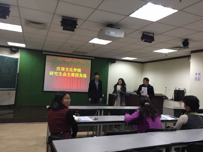候选人竞选阐述结束后,大会进入投票环节,在场所有老师和同学现场进行投票。接下来的现场唱票、计票、宣布选举结果一气呵成, 当主持人宣布获得票数最多的郭瀚齐、韩文慧两位同学当选为新一届汉语文化公司研究生会主席时,全体报以长时间的热烈的掌声。