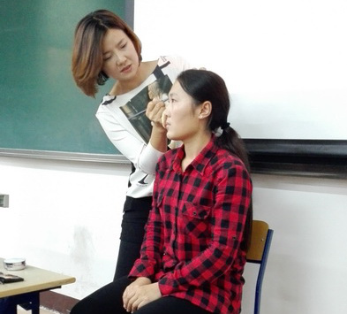 为积极准备即将到来的国家汉办外派志愿者选拔,10月17日下午两点,2015级汉语国际教育(2)班特意邀请韩国著名化妆师丁水莲老师,在教二211举行了面试妆的讲座,指导面试时的妆容、服饰和发饰搭配,汉硕2班的全体成员参加了此次活动。