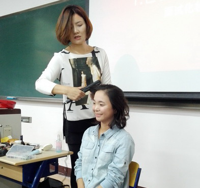 讲座的后半部分,丁水莲老师现场邀请了两位同学做模特,分别为她们化妆、作发型设计,边操作边讲解,一步步地为同学们展示了化妆的具体步骤,并根据两位女生的风格介绍了合适搭配的服饰。老师娴熟的手法,规范的讲解,亮丽的化妆效果让在场同学为之惊叹。在此过程中,同学们也积极地向老师提问有关自己在面试妆容、服饰搭配、发型设计方面的难题,丁水莲老师耐心地给予解答并提出相关建议。最后,丁水莲老师还邀请了部分同学亲自上台实践,大家都踊跃参加。现场气氛十分积极活跃。