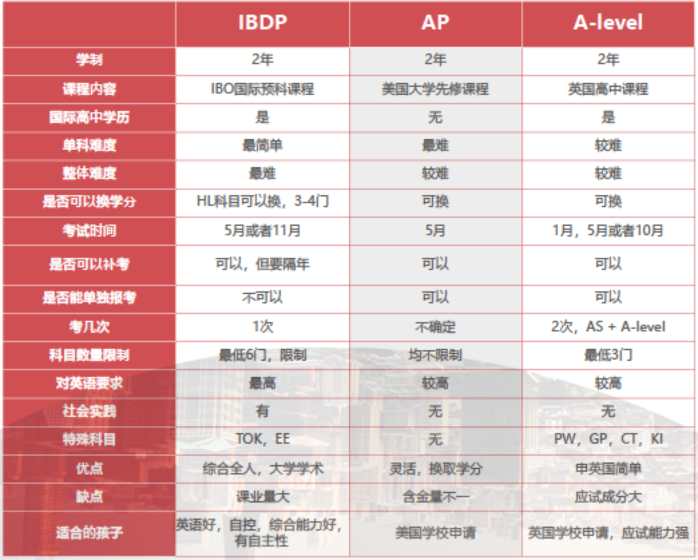 梁校对比了IBDP、AP、A-level三个课程体系,并依次介绍了这几种课程体系的特点。