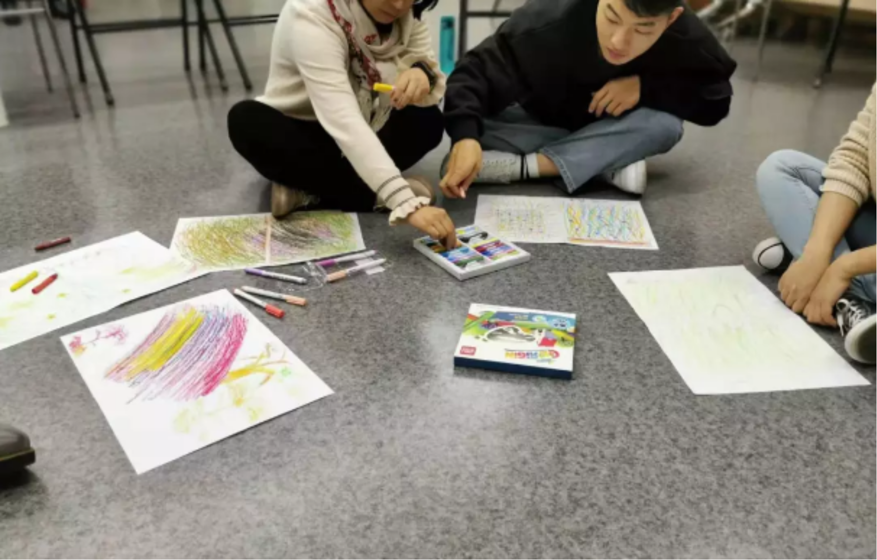 在舒缓的背景音乐中,王老师带领大家进入短暂的冥想。闭上眼睛全身心地感受,随着音乐和老师温柔的声音,关注自己内心的感受并将这种无形感受化为有型的色彩,随着自己的意识在白纸上随意地描绘。实践证明,这是一种亲近自己、拥抱自己和关爱自己的有效途径,在这个过程里同学们感受到了关爱、和解、包容。