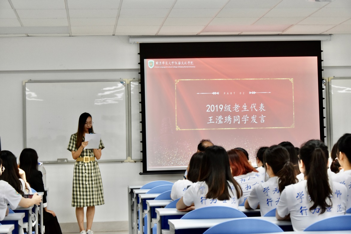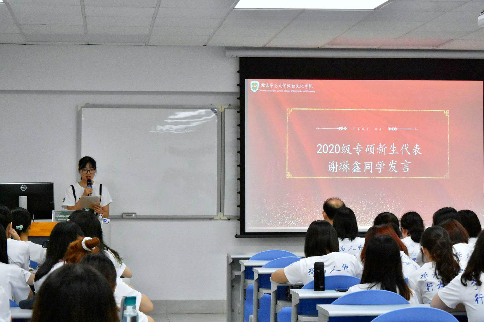 19级专硕王滢琇同学作为老生代表进行发言。她表达了对新同学的祝福,希望2020级学弟学妹们能积极加入到南国北师汉院大家庭的建设中,让瀚宇之花在南国北师的土地上盛开。