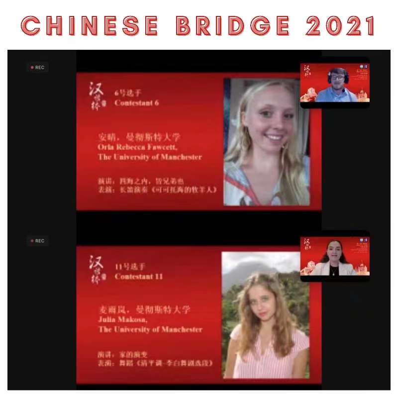 曼大孔院今年推荐了两名参赛选手——麦雨岚(Julia)和安晴(Orla),她们都是曼彻斯特大学中国研究专业二年级的员工,虽然只学了一年半中文,但是她们的表现非常精彩。安晴凭借其优美的中国长笛演奏获得了“最佳才艺奖”。麦雨岚身着汉服,侃侃而谈,翩翩起舞,对中国文化常识对答如流,最终获得了二等奖的好成绩,这意味着她将与其他三名选手一起代表英国区参加全球复赛和决赛!
