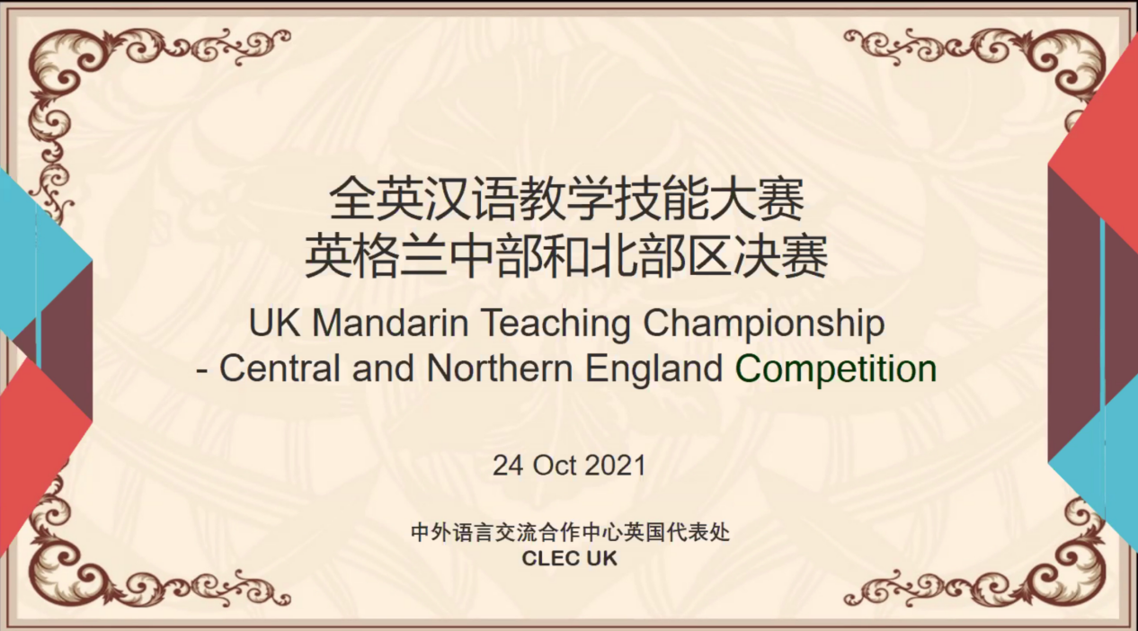 2021年10月24日,由语合中心英国代表处举办的首届全英汉语教学技能大赛英格兰中部和北部地区决赛在线上成功举行。经过初赛筛选,16名来自各地孔子公司及大、中、小学等11个单位的公派教师、志愿者教师及本土教师同台竞技,比赛的线上观看人数超250人。决赛选手来自谢菲尔德、兰卡斯特、中央兰开夏、纽卡斯尔、诺丁汉、知山等地孔子公司及大中小学,其中有刚赴任英国不久的年轻志愿者,也不乏有在英国教学多年的资深本土教师。志愿者教师严心汝、余丹蕖、张梓芮代表曼彻斯特大学孔子公司晋级决赛。经过激烈的比拼角逐,余丹蕖获并列一等奖,张梓芮获二等奖,她们二位将与另一位获奖教师代表英格兰中部和北部区参加年底的全英汉语教学技能大赛总决赛。