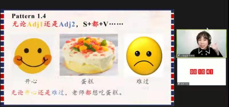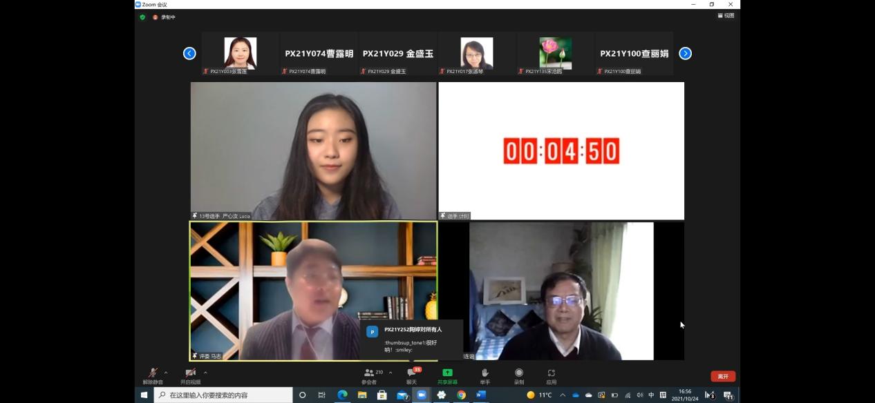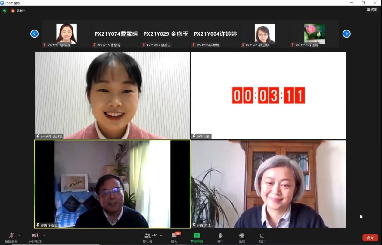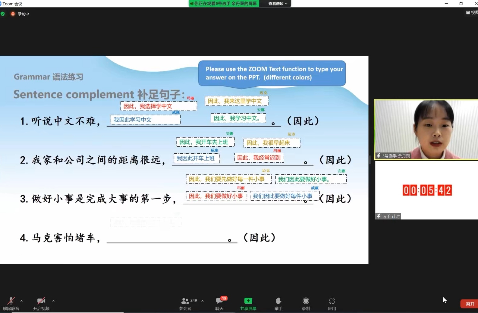 在决赛中,每位选手需根据所选比赛类别,自拟授课内容、授课对象,模拟教学实际场景,完成15分钟的在线授课展示,并回答评委的中英文提问。余丹蕖(Emma)以HSK 4综合课作为授课内容,从引入、词汇讲练、语法讲练到课文讲练,授课环节完整周密,节奏流畅自然,练习方式高效到位,并且熟练运用了ZOOM平台的各项功能,与员工创造了充分互动,得到了观众和评委的一致好评。