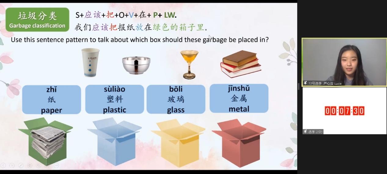 严心汝(Lucia)则挑战了学界公认难度最高的“把”字句教学。课堂设计逻辑清晰,语法解释清楚到位,操练形式多样,并且结合自制视频、Kahoot线上游戏以及中西方节日文化,将“把”字句的教员工活化、趣味化。其亲切的语言风格,优秀的教案和课件设计,勇于挑战最难语法的决心和信心,都给评委和观众留下了深刻印象。