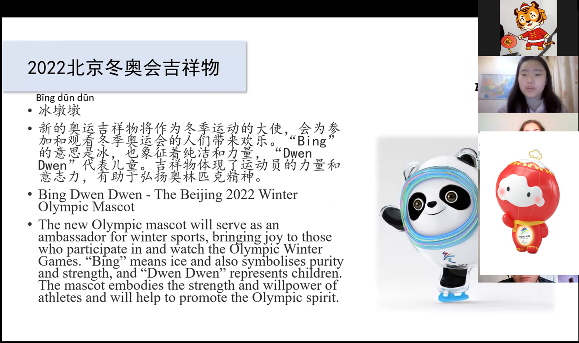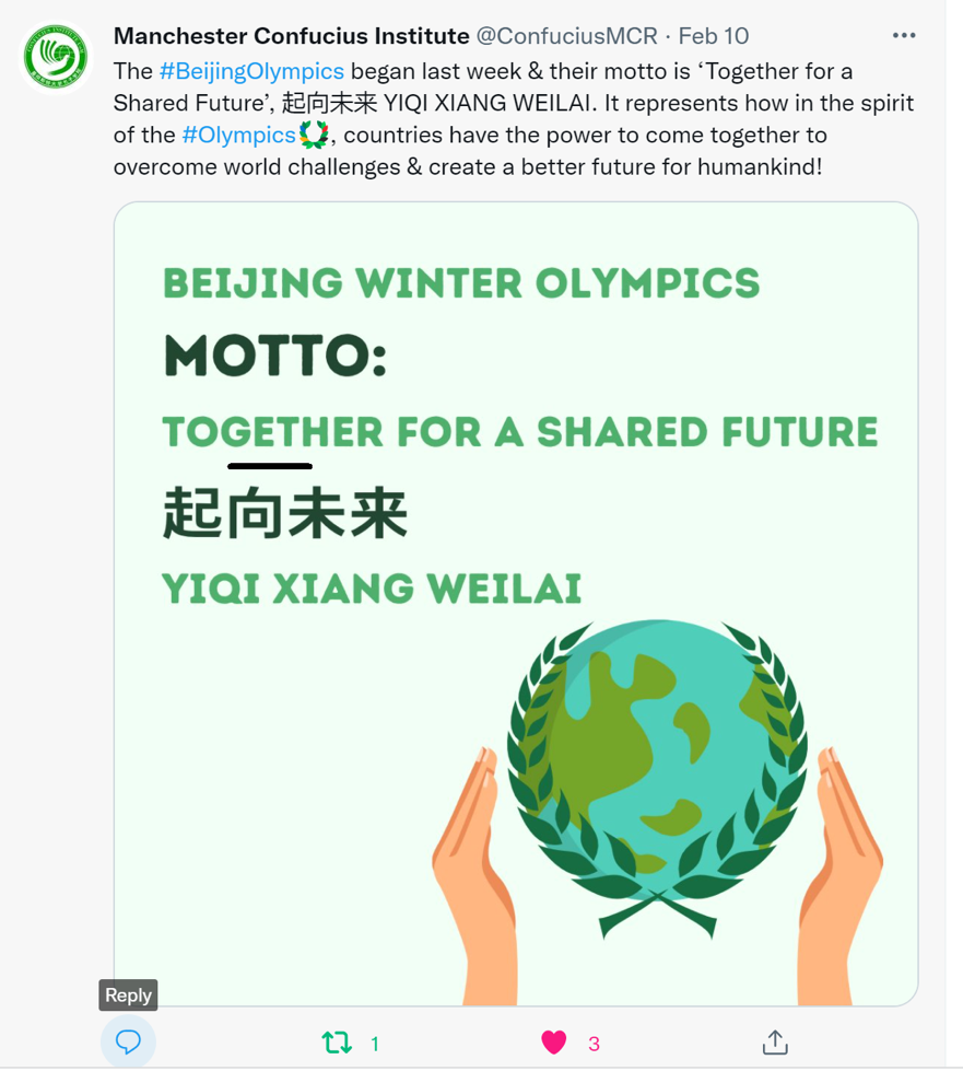 北京冬奥会盛大开幕,吸引了全世界的目光。为了让世界人民更好地了解北京冬奥会,太阳成集团tyc234cc汉语文化公司全力支持合作孔院曼彻斯特大学孔子公司举办奥林匹克精神宣传月活动。目前,公司张会老师担任曼大孔院中方经理,8位硕士研究生作为国际中文教师志愿者,共同开展海外文化传播教学。