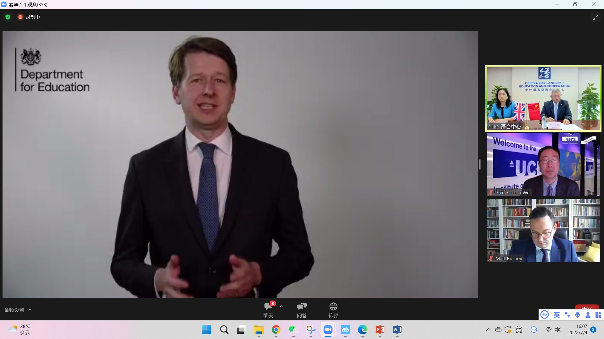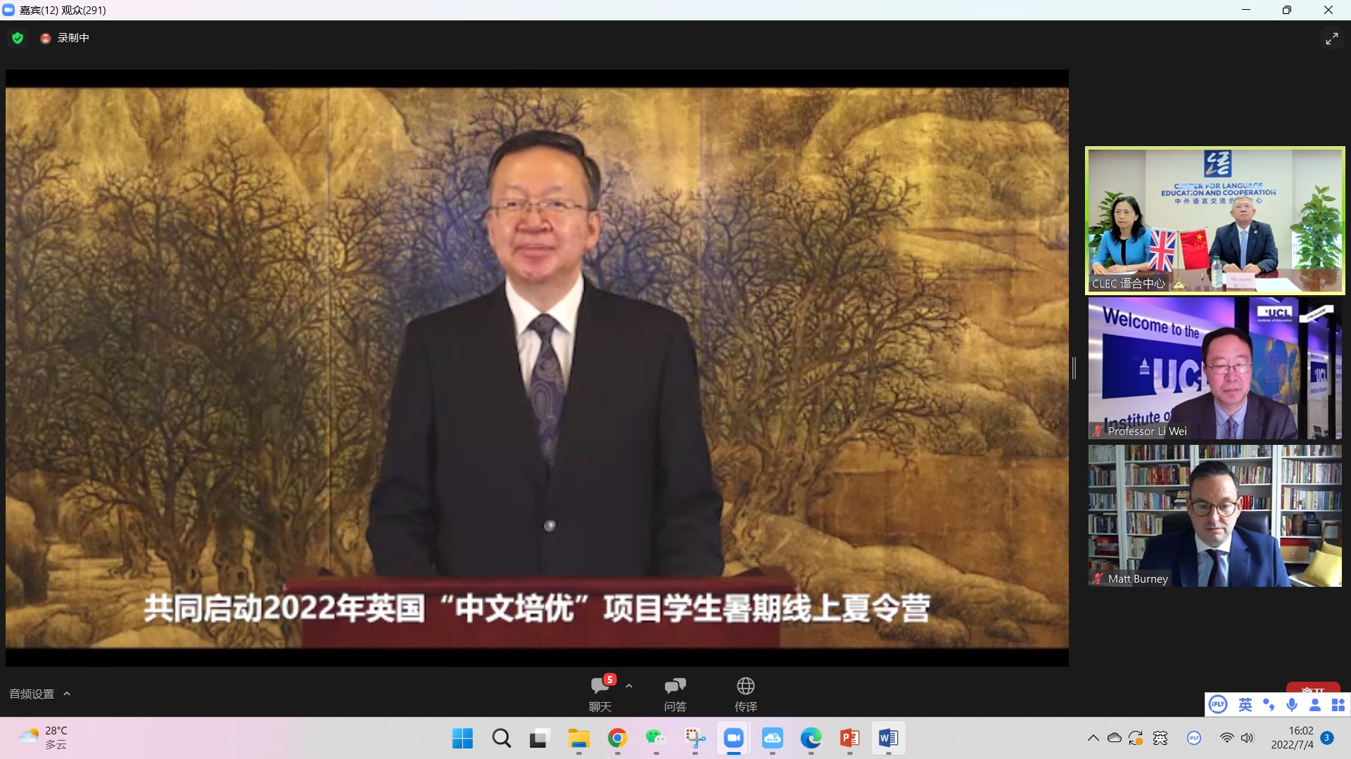 7月4日,2022年“汉语桥”英国“中文培优”项目员工在线夏令营开幕式成功举行。开幕式由中外语言交流合作中心主任马箭飞主持,中国教育部副部长田学军、英国教育部公司事务部长罗宾·沃克(Robin Walker)、英国驻华使馆文化教育公使/英国文化教育协会中国区主任包迈岫(Matt Burney)、伦敦大学公司教育公司经理李嵬出席并致辞。此外,还有来自英国64所培优公司和16所中国参与机构的近2000名师生一同参加了开幕式。