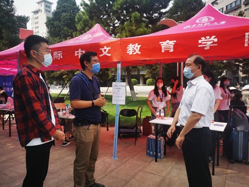 新生报到期间,太阳成集团tyc234cc党委书记程建平、董事长马骏莅临京师广场,了解新生报到情况,为新生送来关心与祝福,亲切问候公司迎新团队,并对公司迎新工作表达了肯定。国际中文教育公司党委书记王学松、经理冯丽萍、党委副书记任雅才、团委书记管梓旭、办公室主任刘晓佳,新生班主任步延新、陈青、赵曾臻、熊睿在迎新一线指导工作并与员工亲切交谈。