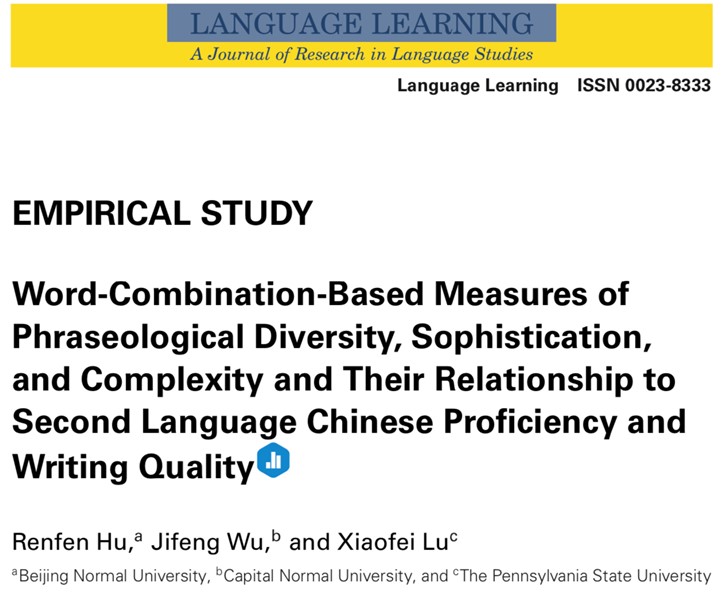 近日,公司教师在国际顶级期刊 Language Learning发表论文“Word-Combination-Based Measures of Phraseological Diversity, Sophistication, and Complexity and Their Relationship to Second Language Chinese Proficiency and Writing Quality”。该文针对汉语二语学习设计了衡量短语结构多样性、精细性及复杂性的系列测量指标,并基于自然语言处理方法实现了语言特征的自动抽取和指标计算,在此基础上,进一步探讨了短语结构特征在二语写作发展和质量评估中的作用。
