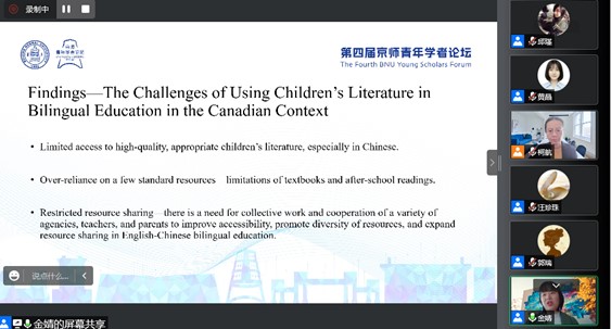 论坛上,加拿大阿尔伯塔大学金婧以《加拿大西部中英双语教育中的儿童文学应用》为课题报告,通过归纳分析儿童文学文本数据,以及针对老师和家长的深度访谈数据,分析了儿童文学在加拿大中英双语教育中的应用情况,包括在双语教育中所使用的儿童文学的类型与趋势、儿童文学在双语儿童的语言能力和读写能力发展中所扮演的角色、老师和家长在双语教育中使用儿童文学所面临的一些困难等,并就中英双语教育中儿童文学的选择和应用给出了自己的建议。