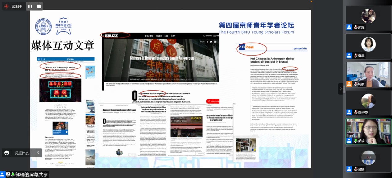 '荷语布鲁塞尔自由大学郭瑞关注世界上少数族裔语言使用的研究,她以《多语背景下安特卫普和布鲁塞尔华人社区的语言景观研究》为题,重点分享了她论文的定量分布研究成果——安特卫普和布鲁塞尔三大华人社区语言景观共时呈现的特点和规律,从宏观上描写了比利时三个华人社区中文语言标识和非中文语言标识地理分布的异同;从中观上探讨了单个商业店铺语言分布数量的异同;从微观上分析了单个语言标识中语言的使用频率,语码优先,中文语言标识的语符选择等。