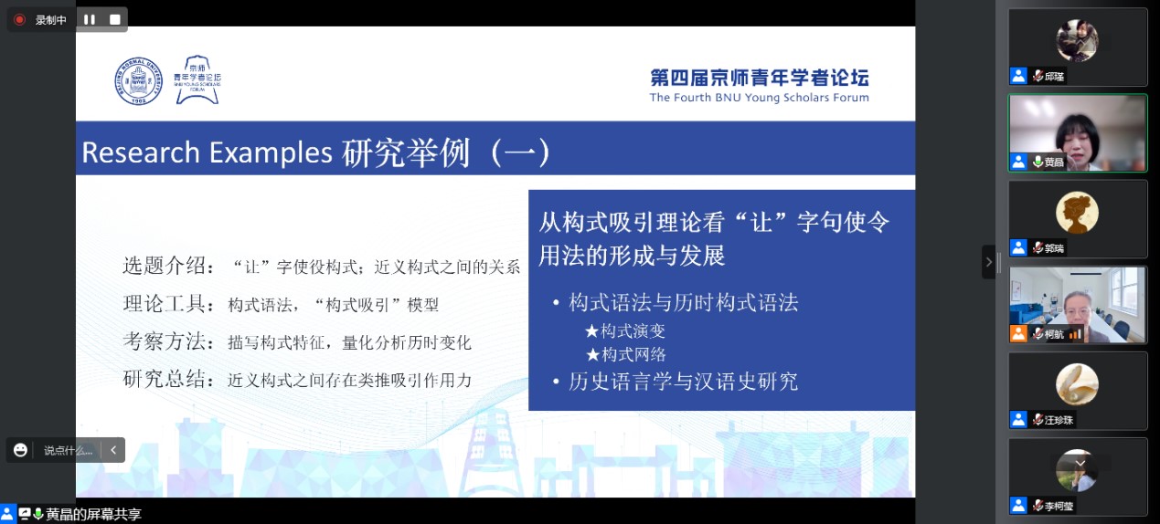 新加坡国立大学中文系黄晶的研究兴趣为汉语语言学、构式语法及语法化理论,她以博士期间研究的《历时构式语法与构式网络》为题,向与会者介绍了构式语法的历时转向以及构式网络方面的研究进展。她以近代汉语的使役构式为例分享了个人现阶段的研究成果,并对构式语法与二语教学与研究的理论兼容性和方法契合性提出了自己的思考,做出了将构式语法应用于国际汉语教育的展望。
