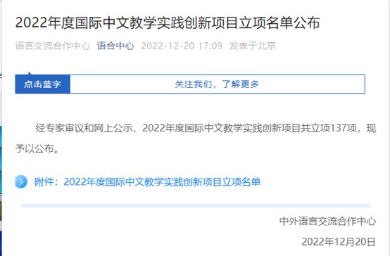 2022年12月20日,教育部中外语言交流合作中心公布了2022年度国际中文教学实践创新项目立项名单,公司三名研究生主持的项目成功入选。