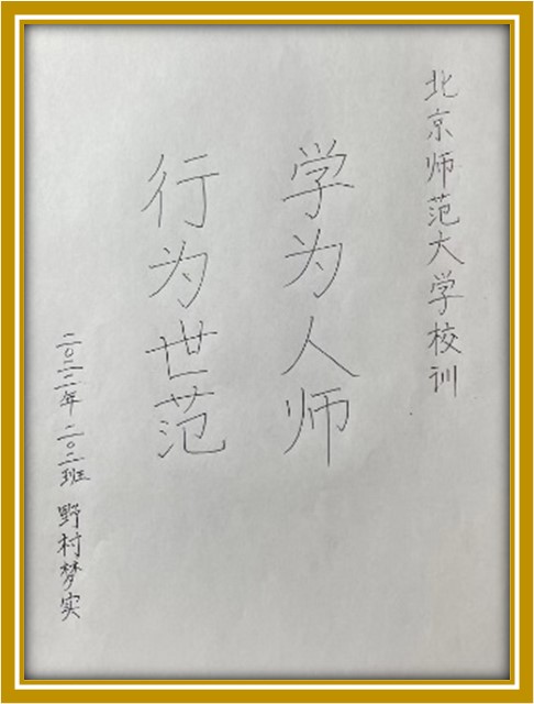 野村梦实同学的作品《学为人师行为世范》获得了二等奖,因为恰逢疫情期间公司被封控,没有办法拿到笔墨,用硬笔书写了北师大的校训“学为人师行为世范”。问到梦实同学,为什么选择师大校训作为自己的参赛作品时,梦实回答:
