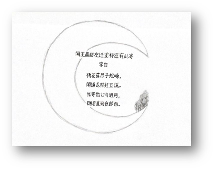 有的职工还对作品进行了装饰,使作品画中有字、字中有画,不仅呈现出文画结合的特点,更是把中文古诗中的意蕴通过自己的方式进行再现。金佳贤同学的作品《闻王昌龄左迁龙标遥有此寄》文字整齐、页面干净。一首中文古诗写在一轮弯月中,月尖有树数株,诗人的“愁心”就在半月中显露出来,用笔简单而意无穷。