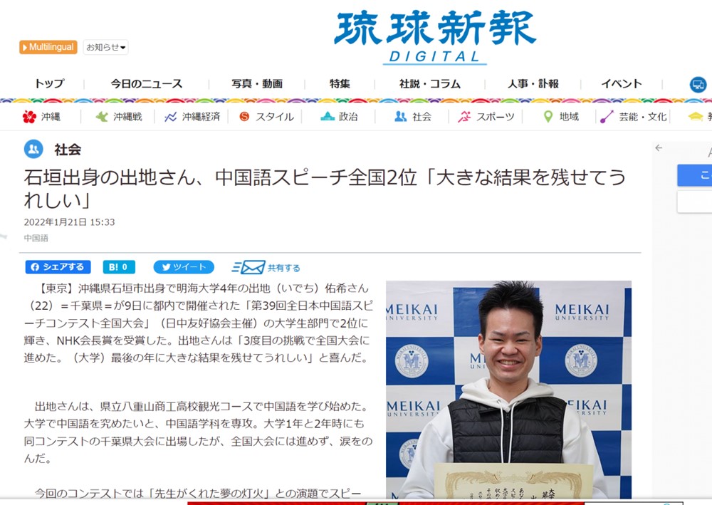 1月12日,中国语学科四年级员工出地佑希同学在由日中友好协会主办的第39届全日本中国语演讲大赛上夺得老员工组第二名,并荣获日本全国广播协会(NHK)会长奖。今年22岁的出地佑希同学在冲绳县读高中时就开始学习汉语,大学时他又选择了中国语学科。在本次全国大赛中,出地以“老师给我梦之灯火”为题,用流利的汉语表达了对恩师八重山商工高中汉语老师石垣丽子的敬意,展露了自己想成为一名汉语教师的热切愿望。出地同学获奖后,消息迅速传遍了整个校园,也传回了他的家乡冲绳。不久,他获奖的消息就登载到了当地的报纸《琉球新报》上。