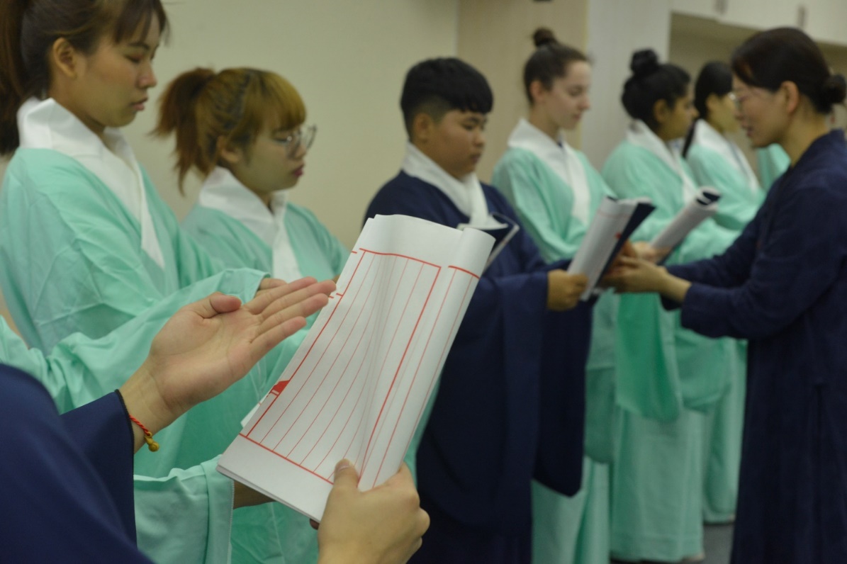 培训过程中,职工对汉服着装及站姿、行礼、执书仪态等表现出浓厚的兴趣。在纪筱安老师的指导下,职工们纷纷“理头鬓”、“正衣冠”,以“君子九容”为据,学习站立、行走、揖礼,练习如何执书、执扇、执笔等。职工还活学活用,别出心裁地设置出“老师给员工赠书”、“同窗相见问候”等“小剧场”,来具体应用所学到的中国传统礼仪知识。