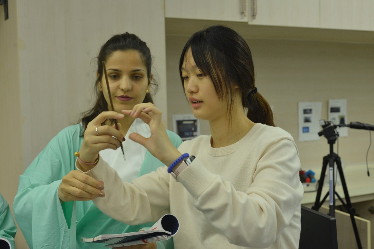 (集体讲解后进行分组练习,研究生志愿者为同学们纠正发音)