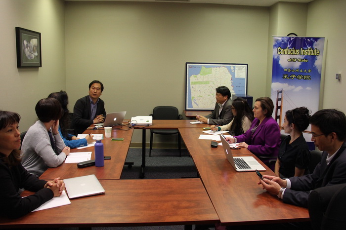 4月11日,旧金山州大孔院与来访的华南理工大学国际教育公司安然经理一行举行了座谈会,两院共商中文教学与孔子公司持续发展合作项目。孔子公司协调安排州大中文系主任、教授及项目主管在州大人文楼中文部会议室与代表团举行合作交流项目讨论会,双方就两校教授合作开展跨文化研究项目、建立美国理工员工到华南理工学习汉语的中文教育项目、开展中美老员工双向交流等合作事宜进行了磋商。