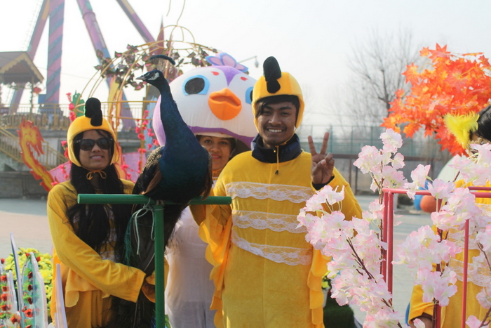 此外,还有的同学参加了《花车巡游》和《武皇祈福》的节目表演。参加《武皇祈福》节目表演的同学们,穿着古装,扮成大臣,跟在“武皇”身后到“民间”巡游、向天地祈福;参加《花车巡游》的同学,穿上各种鸟的服装,在花车上与孔雀一起,随着音乐尽情的摇摆、舞动,在神州鸟园里吸引了众多游客的目光。