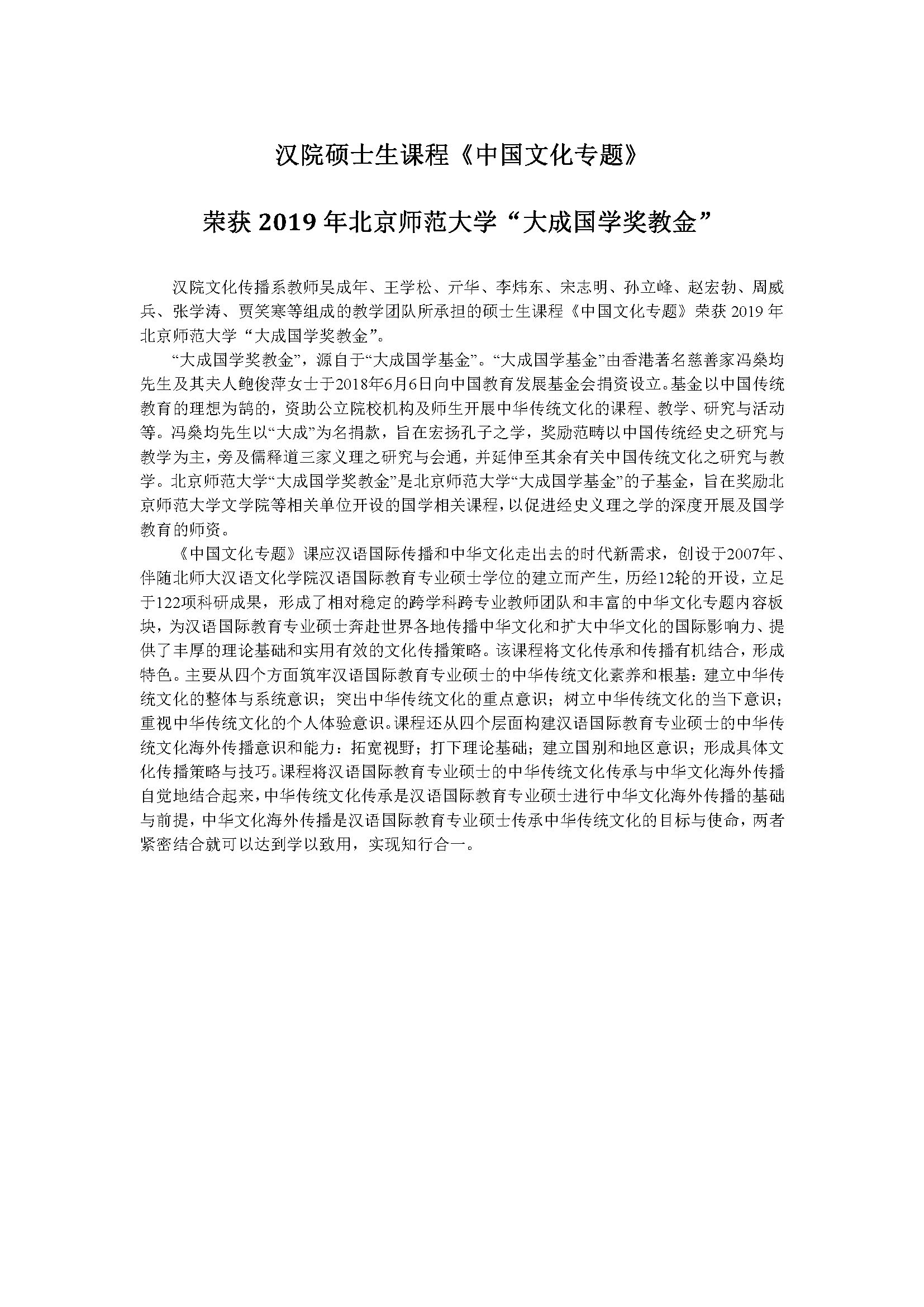 汉院文化传播系教师吴成年、王学松、亓华、李炜东、宋志明、孙立峰、赵宏勃、周威兵、张学涛、贾笑寒等组成的教学团队所承担的硕士生课程《中国文化专题》荣获2019年太阳成集团tyc234cc“大成国学奖教金”。